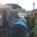 Wir fuhren früh los damit wir in Bottighofen bei Cornelia's Eltern um 9:30 beim Morgenessen waren. Nach dem feinen Morgenessen auf dem Balkon, machte Luca noch eine Probefahrt mit seinem neuen "Töffli". Nun dieses konnten wir nun leider nicht mehr mitnehmen. Unser Weg ging nun über Aarbon, wo wir im Caravan Center noch einen kurzen halt machten, um nach einem Vorzeltteppich zu schauen. Es hatte aber nichts was uns zusagte. Wir fuhren in Diepoldsau über die Grenze und auf die Österreichische Autobahn. Das Wetter war etwas durchzogen aber trocken. Wir hatten eine 10 Tages Digitale Vignette gekauft auch für den Aarlberg Tunnel doch dort funktionierte diese nicht wie gewünscht und die Schranke ging nicht automatisch hoch. Doch nach kurzer Rückfrage öffnete sich die Schranke. Wir gingen dann vor Innsbruck in Völs noch einkaufen. Um etwa 16 Uhr waren wir auf dem Camping Natterersee in Natters bei Innsbruck. Der Platz der uns zugeteilt wurde passte uns nicht so sehr, aber wir konnten noch wechseln. Luca stellte sein separates Zelt auf also hatten wir drei etwas mehr Platz im Wohnmobil. Am Abend grillierten wir noch und machten eine Platzrunde.