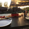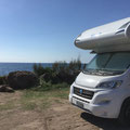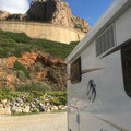 Heute konnten wir schon beim Morgenessen den Wellenreiter zu sehen. Danach fuhren wir weiter zum Reiskornstrand. Ein sehr schöner Strand, der uns sehr gefiel. Das Wasser war kristallklar und man durfte kein Sandkorn vom Strand wegtragen :-) Weiter ging dann die Reise zum Stellplatz Area Costa Camper di S'Abba Drache bei Bosa. Dort wurde man schon bei der Abfahrt von der Hauptstrasse von drei älteren Herren auf ihren Plastikstühlen empfangen. Danach ging es etwa 2 Kilometer über einen Feldweg zum Stellplatz. Wir fanden danach einen schönen Platz direkt am Meer. Wir erkundeten noch ein wenig die Gegend mit Restaurant und Badebuchten. Am Abend versuchten wir ein Raclette zu machen, doch unser nur mit Kerzen betriebenes Rechaud vermochte der Meeresbrise nicht ganz stand zu halten. :-) ( Wieder Berner Nachbarn mit YB Kleber und hinter uns ein Paar aus Deutschland die auch auf den Liegestühlen auf der Fähre praktisch neben uns wahren )